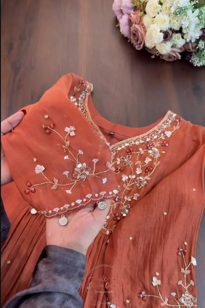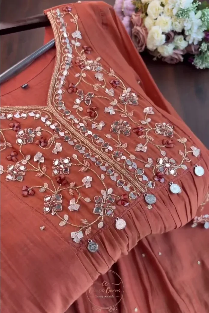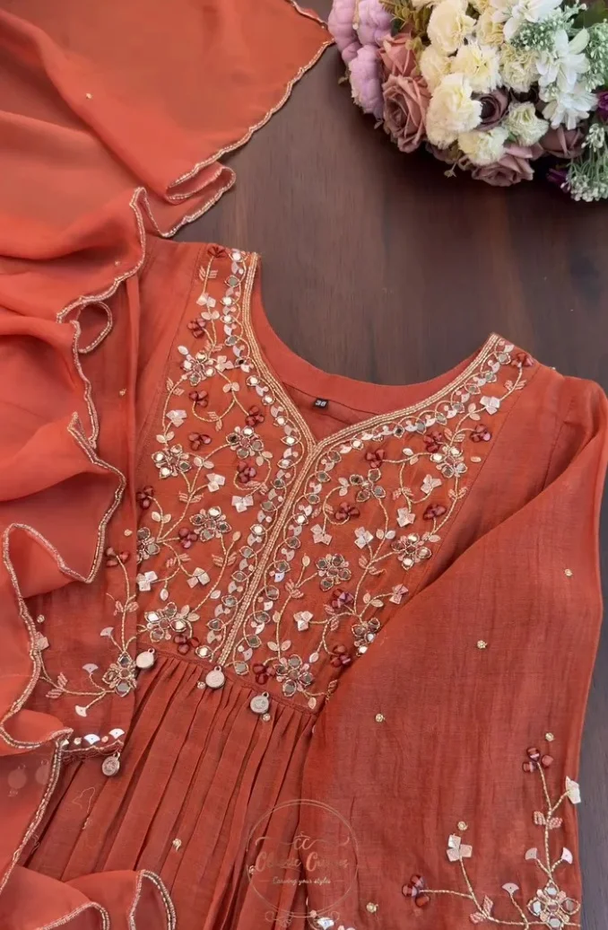 Pair this stunning outfit with oxidized silver jhumkas and embellished mojaris to lean into the bohemian-ethnic vibe. Whether it’s a sunset Mehendi ceremony or a festive Diwali party, this rust-orange ensemble ensures you are the center of attention.