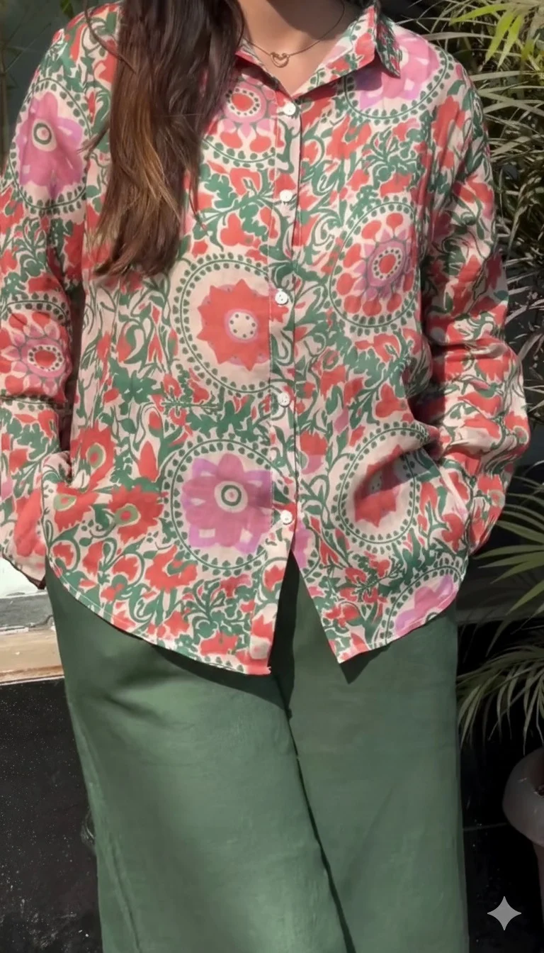 The centerpiece of this set is the long-sleeved button-down shirt, featuring an intricate mandala-inspired floral print. The design is a rich tapestry of coral pinks, vibrant reds, and soft greens set against a clean cream background. Each circular motif is framed by swirling botanical vines, giving the garment a hand-painted, bohemian feel. Crafted from a premium lightweight cotton-linen blend, the shirt offers exceptional breathability and a soft, lived-in feel from the first wear. The classic pointed collar and clean placket allow the bold print to take center stage, while the relaxed fit ensures comfort throughout the day.